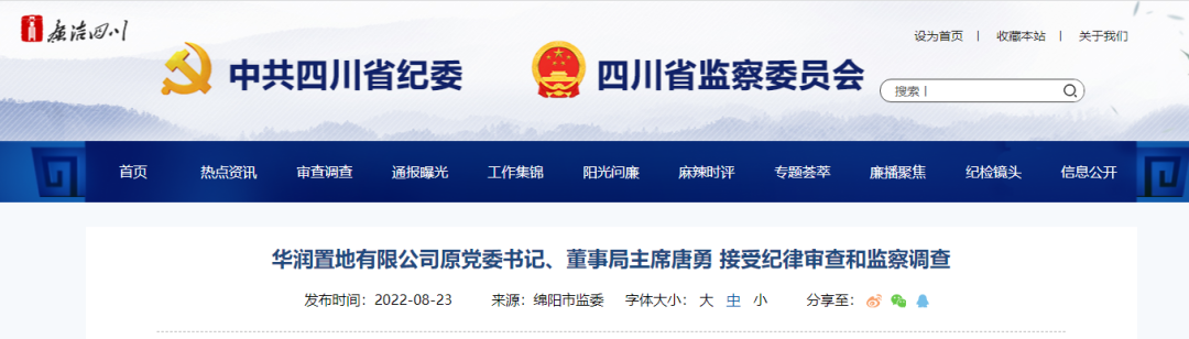 華潤置地有限公司原黨委書記、董事局主席、首席執(zhí)行官唐勇涉嫌嚴重違紀違法,目前華潤集團紀委正對其進行紀律審查,經(jīng)國家監(jiān)委指定四川省監(jiān)委管轄,四川省監(jiān)委指定綿陽市監(jiān)委管轄,綿陽市監(jiān)委正對其進行監(jiān)察調查。
