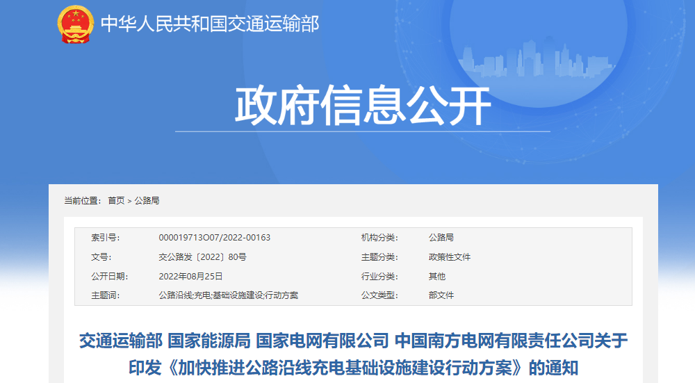 交通運輸部 國家能源局 國家電網(wǎng)有限公司 中國南方電網(wǎng)有限責(zé)任公司關(guān)于印發(fā)《加快推進(jìn)公路沿線充電基礎(chǔ)設(shè)施建設(shè)行動方案》的通知