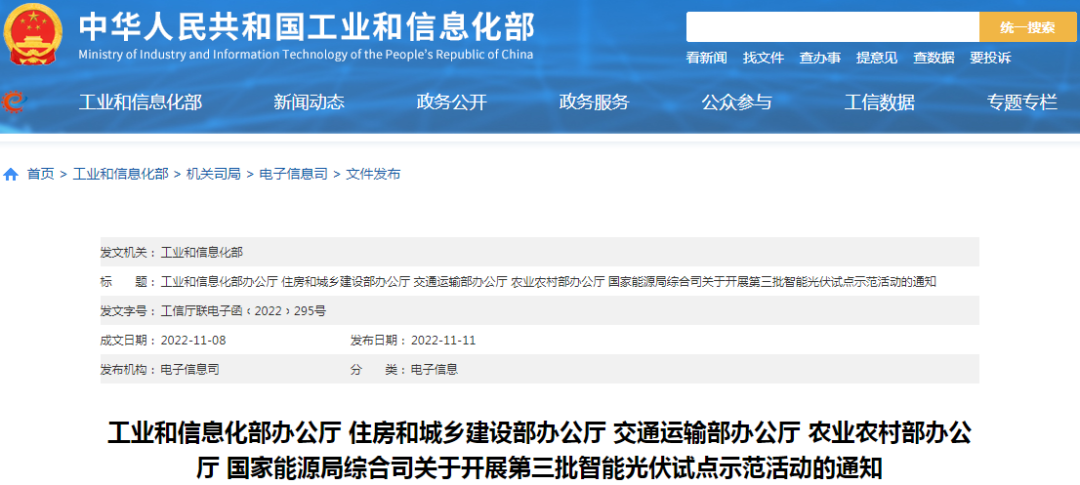 本網(wǎng)訊 11月11日,工信部辦公廳、住建部辦公廳、交通運(yùn)輸部辦公廳、農(nóng)業(yè)農(nóng)村部辦公廳、國家能源局綜合司五部委印發(fā)的《關(guān)于開展第三批智能光伏試點(diǎn)示范活動(dòng)的通知》指出,支持培育一批智能光伏示范企業(yè)以及建設(shè)一批智能光伏示范項(xiàng)目。