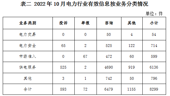 電力行業(yè)排在首位,有效信息數(shù)量為8299件,占全部有效信息的62.69%。群眾關注的內容主要集中在供電服務、電力安全、市場準入等方面。(2022年10月電力行業(yè)有效信息按業(yè)務分類情況見表二)