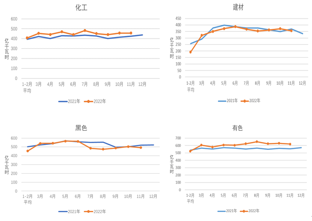 11月份,化工行業(yè)用電量457億千瓦時,同比增長4.0%;建材行業(yè)用電量356億千瓦時,同比下降4.0%;黑色金屬冶煉行業(yè)用電量493億千瓦時,同比下降6.0%;有色金屬冶煉行業(yè)用電量619億千瓦時,同比增長3.7%。