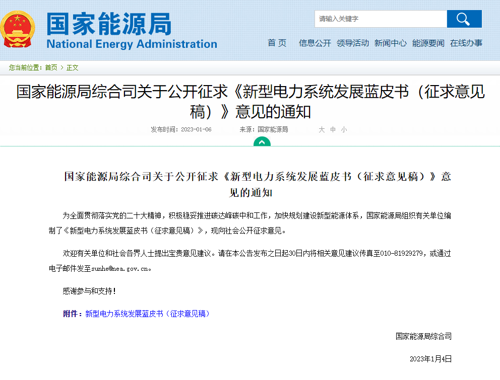 國家能源局綜合司關(guān)于公開征求《新型電力系統(tǒng)發(fā)展藍皮書(征求意見稿)》意見的通知