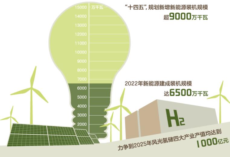 2022年,內(nèi)蒙古新能源建成裝機(jī)規(guī)模達(dá)到6500萬(wàn)千瓦,連續(xù)兩年成為全國(guó)唯一一個(gè)風(fēng)電光伏發(fā)電量超過(guò)1000億千瓦時(shí)的省區(qū)。“十四五”期間,內(nèi)蒙古規(guī)劃新增超過(guò)9000萬(wàn)千瓦的新能源裝機(jī)規(guī)模,力爭(zhēng)到2025年風(fēng)光氫儲(chǔ)四大產(chǎn)業(yè)產(chǎn)值均達(dá)到1000億元。