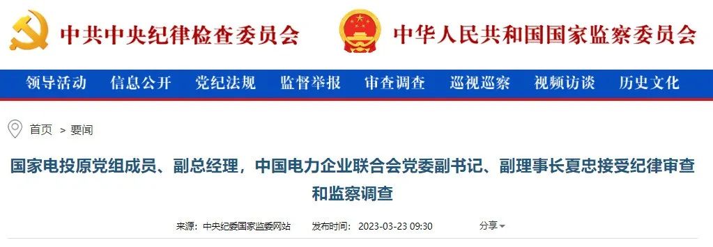 中央紀委國家監(jiān)委網(wǎng)站3月23日消息,國家電投原黨組成員、副總經(jīng)理,中國電力企業(yè)聯(lián)合會黨委副書記、副理事長夏忠涉嫌嚴重違紀違法,目前正接受中央紀委國家監(jiān)委駐國務院國資委紀檢監(jiān)察組和遼寧省盤錦市監(jiān)委紀律審查和監(jiān)察調(diào)查。