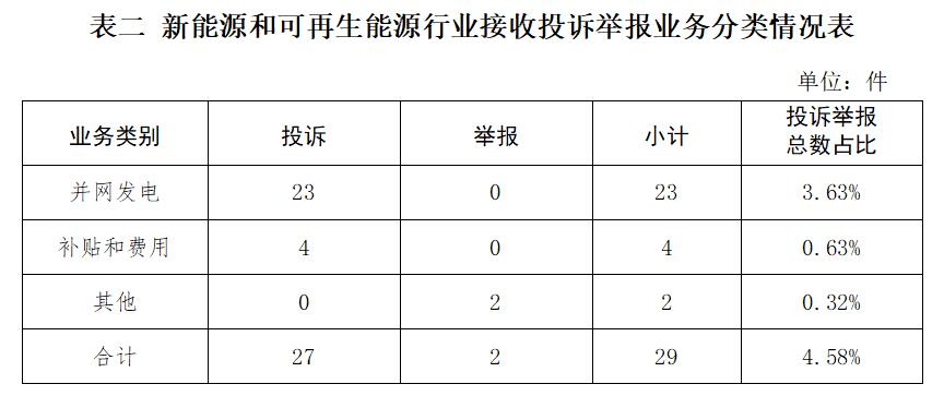 新能源和可再生能源行業(yè)排在第二位,數(shù)量為29件、占投訴舉報(bào)總數(shù)的4.58%,主要集中在并網(wǎng)發(fā)電、補(bǔ)貼和費(fèi)用等方面。(詳見表二)