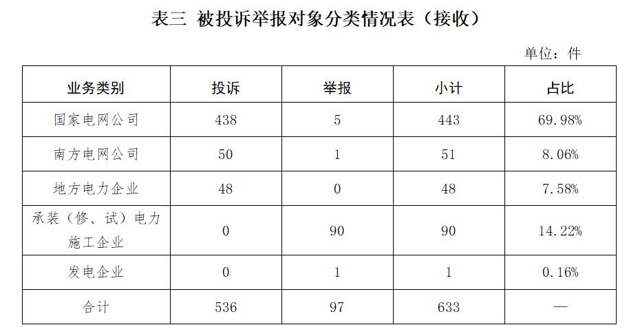 針對(duì)供電企業(yè)的投訴舉報(bào)542件、占比85.62%,其中國家電網(wǎng)公司443件、占比69.98%,南方電網(wǎng)公司51件、占比8.06%,地方電力企業(yè)48件、占比7.58%;針對(duì)承裝(修、試)電力施工企業(yè)的投訴舉報(bào)90件、占比14.22%;針對(duì)發(fā)電企業(yè)的投訴舉報(bào)1件、占比0.16%。(詳見表三)