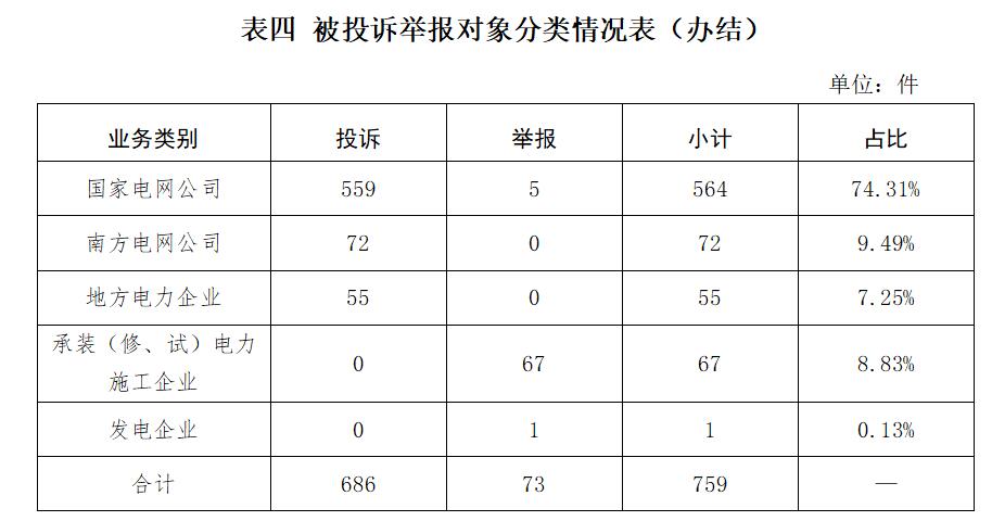 從被投訴舉報(bào)對(duì)象看,供電企業(yè)691件、占比91.04%,其中國家電網(wǎng)公司564件、占比74.31%,南方電網(wǎng)公司72件、占比9.49%,地方電力企業(yè)55件、占比7.25%;承裝(修、試)電力施工企業(yè)投訴舉報(bào)67件、占比8.83%;新能源企業(yè)投訴舉報(bào)1件、占比0.13%。(詳見表四)