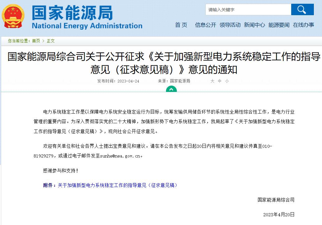 國家能源局綜合司關(guān)于公開征求《關(guān)于加強(qiáng)新型電力系統(tǒng)穩(wěn)定工作的指導(dǎo)意見(征求意見稿)》意見的通知