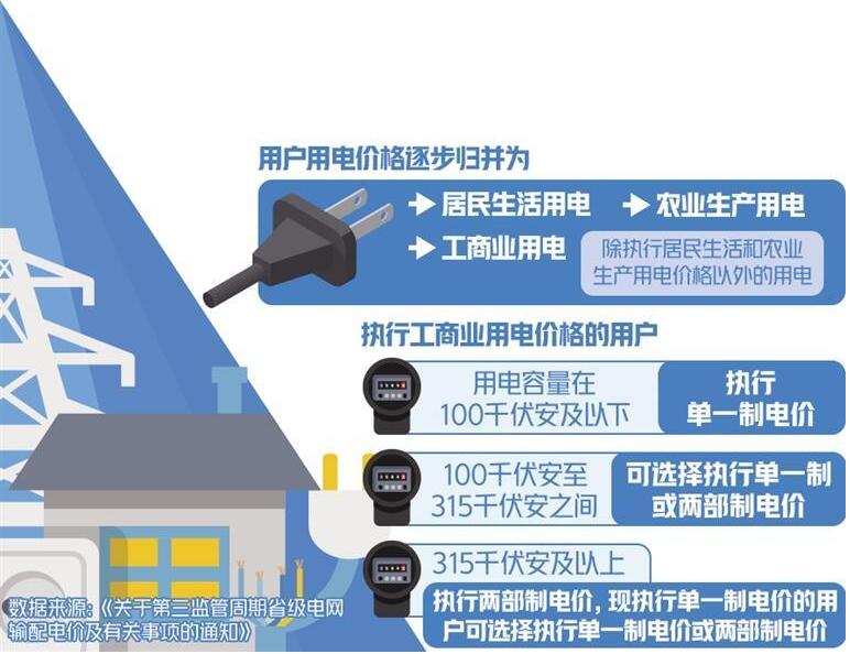 《通知》提出,執(zhí)行工商業(yè)用電價(jià)格的用戶,用電容量在100千伏安及以下的,執(zhí)行單一制電價(jià);100千伏安至315千伏安之間的,可選擇執(zhí)行單一制或兩部制電價(jià);315千伏安及以上的,執(zhí)行兩部制電價(jià),現(xiàn)執(zhí)行單一制電價(jià)的用戶可選擇執(zhí)行單一制電價(jià)或兩部制電價(jià)。