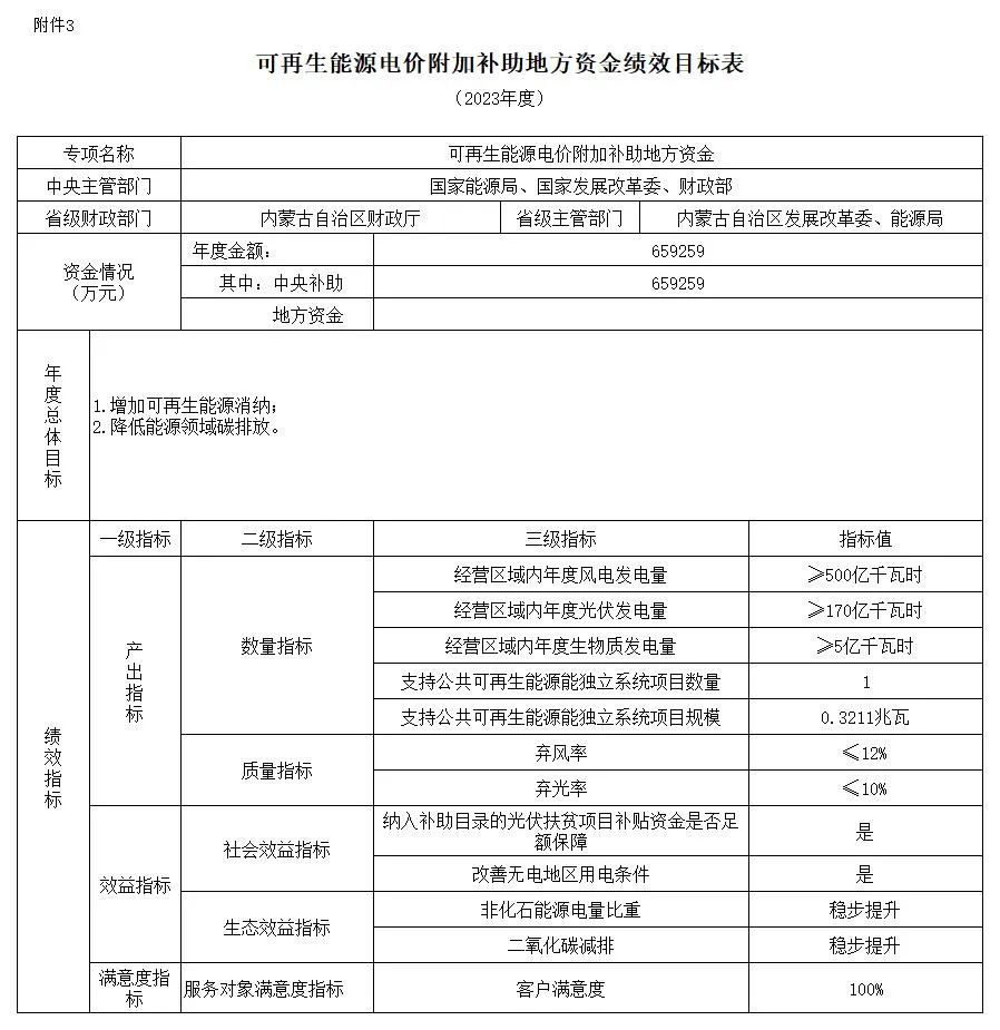 根據(jù)財(cái)政部會(huì)同有關(guān)部門印發(fā)的《關(guān)于印發(fā)<可再生能源電價(jià)附加資金管理辦法>的通知》(財(cái)建〔2020〕5號(hào),以下簡(jiǎn)稱《資金管理辦法》)、《關(guān)于<關(guān)于促進(jìn)非水可再生能源發(fā)電健康發(fā)展的若干意見(jiàn)>有關(guān)事項(xiàng)的補(bǔ)充通知》(財(cái)建〔2020〕426號(hào))等文件要求以及你單位申請(qǐng),現(xiàn)下達(dá)2023年度可再生能源電價(jià)附加補(bǔ)助資金預(yù)算。資金支付方式按照財(cái)政國(guó)庫(kù)集中支付有關(guān)制度執(zhí)行,具體金額見(jiàn)附件2。項(xiàng)目代碼和名稱為“10000017Z175060070001可再生能源電價(jià)附加補(bǔ)助地方資金”,收入列2023年政府性基金預(yù)算收入科目“1100407節(jié)能環(huán)保”,支出列2023年政府性基金預(yù)算支出功能分類科目“2116001風(fēng)力發(fā)電補(bǔ)助”、“2116002太陽(yáng)能發(fā)電補(bǔ)助”、“2116003生物質(zhì)能發(fā)電補(bǔ)助”,列2023年政府預(yù)算支出經(jīng)濟(jì)分類科目“50799其他對(duì)企業(yè)補(bǔ)助”。有關(guān)事項(xiàng)通知如下: