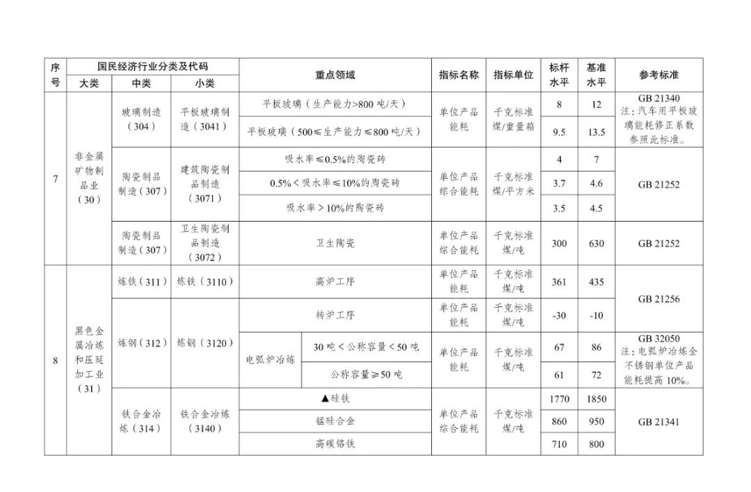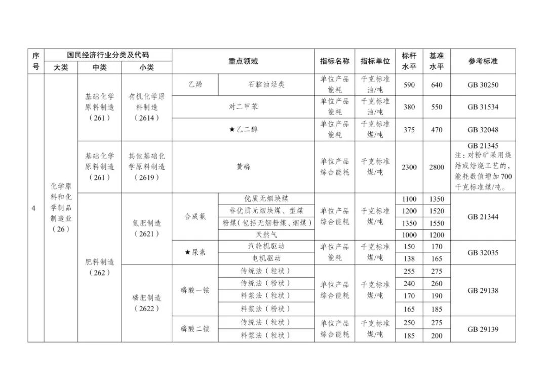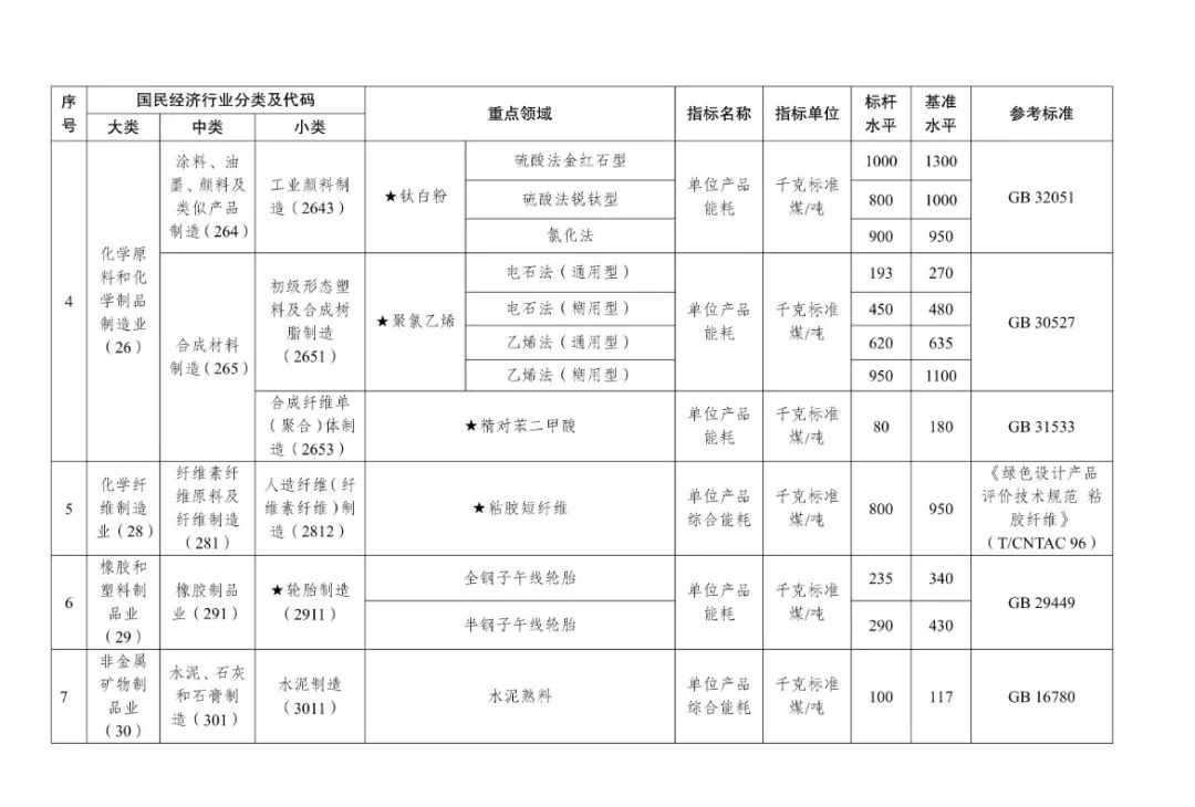 結(jié)合工業(yè)重點(diǎn)領(lǐng)域產(chǎn)品能耗、規(guī)模體量、技術(shù)現(xiàn)狀和改造潛力等,進(jìn)一步拓展能效約束領(lǐng)域。在此前明確煉油、煤制焦炭、煤制甲醇、煤制烯烴、煤制乙二醇、燒堿、純堿、電石、乙烯、對二甲苯、黃磷、合成氨、磷酸一銨、磷酸二銨、水泥熟料、平板玻璃、建筑陶瓷、衛(wèi)生陶瓷、煉鐵、煉鋼、鐵合金冶煉、銅冶煉、鉛冶煉、鋅冶煉、電解鋁等25個(gè)重點(diǎn)領(lǐng)域能效標(biāo)桿水平和基準(zhǔn)水平的基礎(chǔ)上,增加乙二醇,尿素,鈦白粉,聚氯乙烯,精對苯二甲酸,子午線輪胎,工業(yè)硅,衛(wèi)生紙?jiān)?、紙巾原紙,棉、化纖及混紡機(jī)織物,針織物、紗線,粘膠短纖維等11個(gè)領(lǐng)域,進(jìn)一步擴(kuò)大工業(yè)重點(diǎn)領(lǐng)域節(jié)能降碳改造升級范圍。