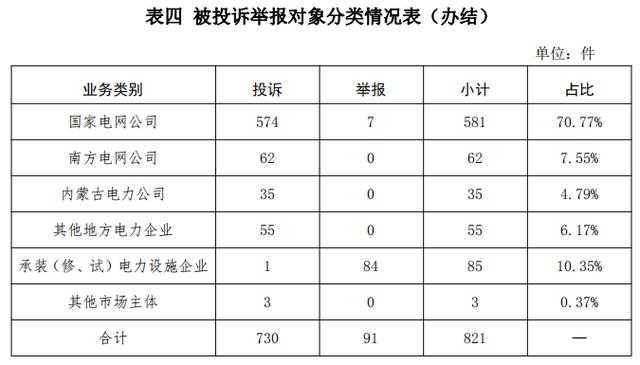 從被投訴舉報對象看,供電企業(yè)733件、占投訴舉報總數(shù)的89.28%,其中國家電網(wǎng)公司581件、占比70.77%,南方電網(wǎng)公司62件、占比7.55%,內(nèi)蒙古電力公司35件、占比3.65%,其他地方電力企業(yè)55件、占比6.17%;承裝(修、試)電力設施企業(yè)85件、占比10.35%;其他市場主體3件、占比0.37%。