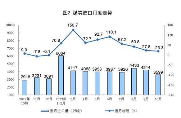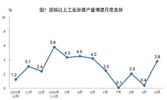 一、原煤、原油和天然氣生產(chǎn)及相關(guān)情況 原煤生產(chǎn)增速加快,進(jìn)口較快增長。10月份,生產(chǎn)原煤3.9億噸,同比增長3.8%,增速比9月份加快3.4個百分點,日均產(chǎn)量1254.0萬噸。進(jìn)口煤炭3599萬噸,同比增長23.3%,增速比9月份回落4.5個百分點。