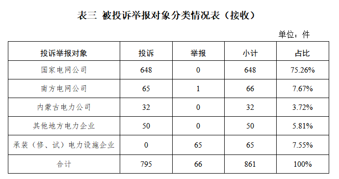 從被投訴舉報對象看,供電企業(yè)760件、占投訴舉報總數(shù)的86.46%,其中國家電網(wǎng)公司584件、占比66.44%,南方電網(wǎng)公司72件、占比8.19%,內(nèi)蒙古電力公司49件、占比5.57%,其他地方電力企業(yè)55件、占比6.26%;承裝(修、試)電力設(shè)施企業(yè)119件、占比13.54%。