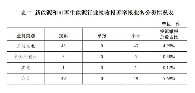 新能源和可再生能源行業(yè)排在第二位,數(shù)量為49件、占投訴舉報總數(shù)的5.69%,主要集中在并網(wǎng)發(fā)電、補(bǔ)貼和費(fèi)用等方面。