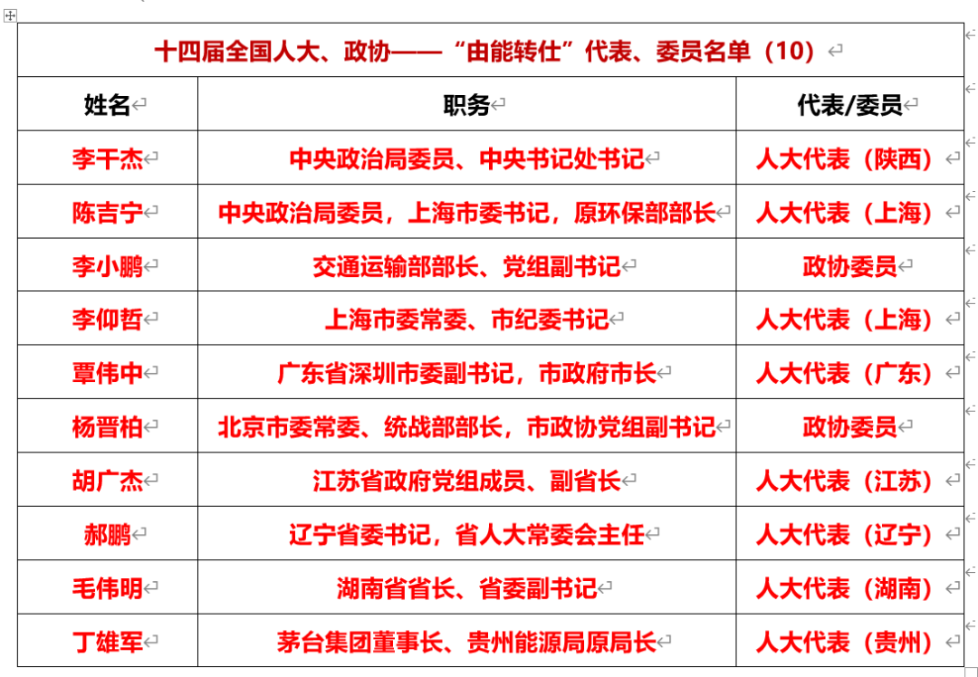 “由能轉(zhuǎn)仕”的十四屆全國(guó)人大代表、政協(xié)委員有10人,其中全國(guó)人大代表8人,政協(xié)委員2人。如中央政治局委員、中央書記處書記李干杰,曾任生態(tài)環(huán)境部原部長(zhǎng)、黨組書記,中央政治局委員、上海市委書記陳吉寧曾任環(huán)保部部長(zhǎng),交通運(yùn)輸部部長(zhǎng)李小鵬曾任中國(guó)華能總經(jīng)理,上海市委常委、紀(jì)委書記李仰哲曾任國(guó)家能源局副局長(zhǎng),深圳市長(zhǎng)覃偉中曾任中國(guó)石油副總經(jīng)理,遼寧省委書記郝鵬曾任國(guó)務(wù)院國(guó)資委主任,江蘇省副省長(zhǎng)胡廣杰曾任中國(guó)海油副總經(jīng)理,湖南省省長(zhǎng)毛偉明曾任國(guó)家電網(wǎng)董事長(zhǎng),丁雄軍曾任貴州能源局原局長(zhǎng)。