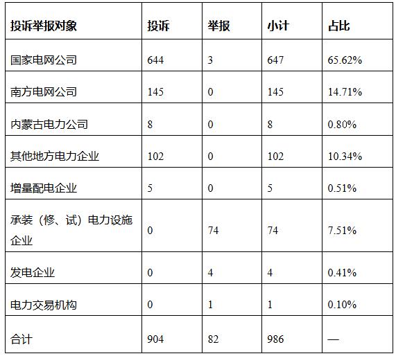 從被投訴舉報(bào)對象看,供電企業(yè)907件、占投訴舉報(bào)總數(shù)的91.99%,其中國家電網(wǎng)公司647件、占比65.62%,南方電網(wǎng)公司145件、占比14.71%,內(nèi)蒙古電力公司8件、占比0.8%,其他地方電力企業(yè)102件、占比10.34%,增量配電企業(yè)5件、占比0.51%;承裝(修、試)電力設(shè)施企業(yè)74件、占比7.51%;發(fā)電企業(yè)4件、占比0.41%;電力交易機(jī)構(gòu)1件、占比0.1%。