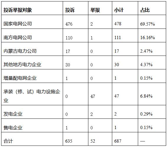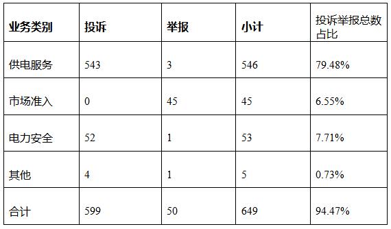 電力行業(yè)排在首位,數(shù)量為649件、占投訴舉報(bào)總數(shù)的94.47%,主要集中在供電服務(wù)、市場準(zhǔn)入、電力安全等方面。