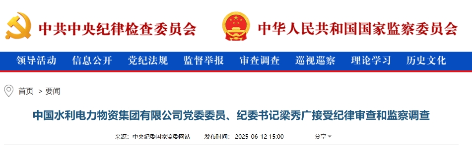 中央紀(jì)委國家監(jiān)委網(wǎng)站6月12日消息,據(jù)中央紀(jì)委國家監(jiān)委駐中國大唐紀(jì)檢監(jiān)察組、江蘇省紀(jì)委監(jiān)委消息:中國水利電力物資集團(tuán)有限公司黨委委員、紀(jì)委書記梁秀廣涉嫌嚴(yán)重違紀(jì)違法,目前正接受中央紀(jì)委國家監(jiān)委駐中國大唐紀(jì)檢監(jiān)察組紀(jì)律審查和江蘇省鎮(zhèn)江市監(jiān)察委員會(huì)監(jiān)察調(diào)查。