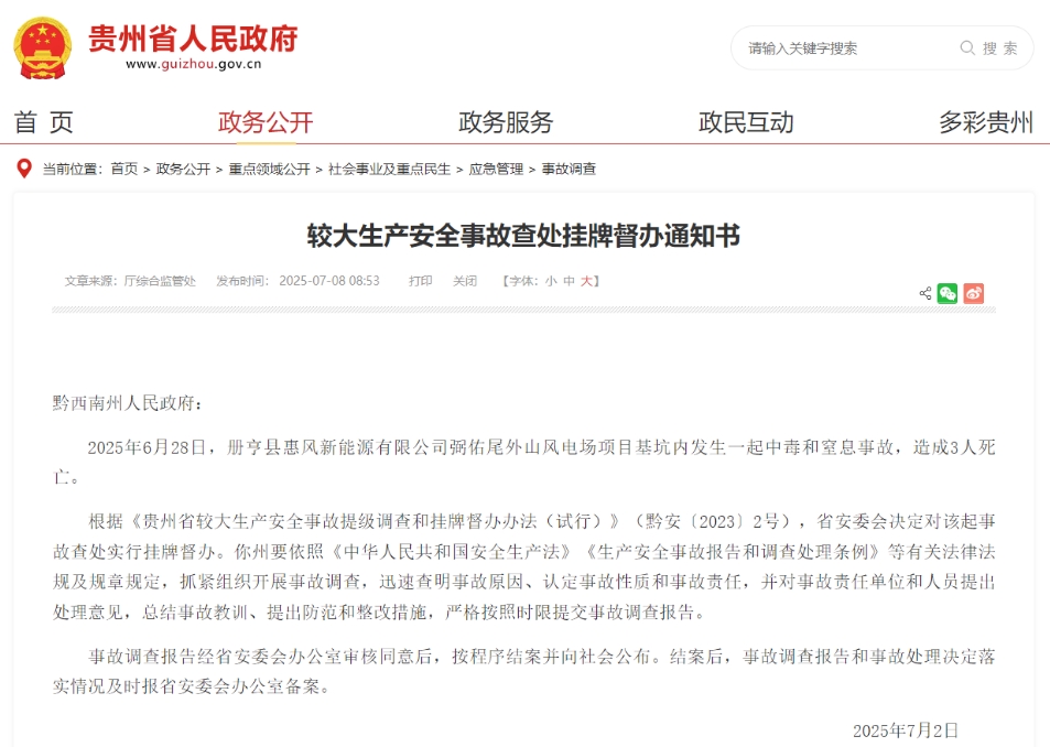 2025年6月28日,冊亨縣惠風新能源有限公司弼佑尾外山風電場項目基坑內發(fā)生一起中毒和窒息事故,造成3人死亡。