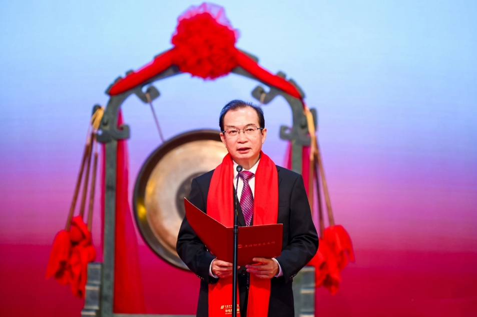 ▲中國華電集團有限公司董事長、黨組書記江毅與部分與會嘉賓共同敲響金鑼,見證華電新能掛牌上市儀式。