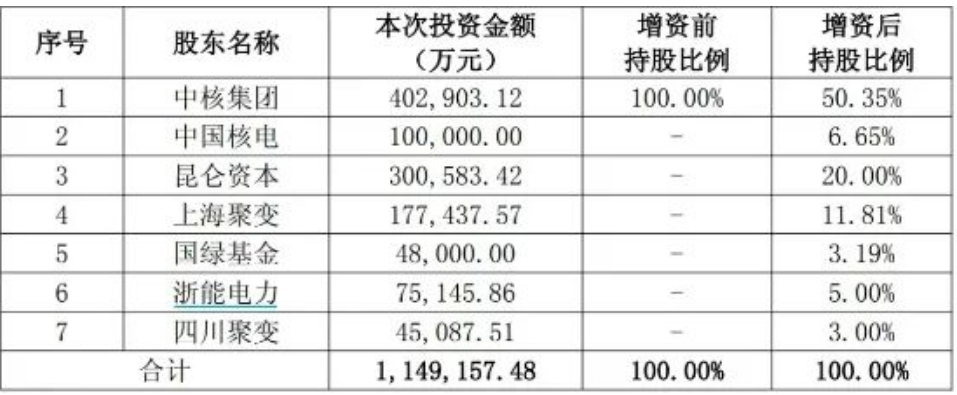 相關信息顯示中核集團、中國核電、浙能電力、中國石油集團昆侖資本有限公司、上海未來聚變能源科技有限公司、國家綠色發(fā)展基金股份有限公司及四川重科聚變能源科技有限公司,以1.0019元/注冊資本的價格,共同向中國聚變能源有限公司投資約114.92億元,認購聚變公司新增注冊資本114.69億元。其中,中核集團本輪出資40.29億元,增資后持有中國聚變公司50.35%股份。中國核電投資金額為10億元,持有聚變公司6.65%股權;浙能電力出資約7.51億元,持有聚變公司5%股權。此外,中石油旗下昆侖資本此次投資約30.06億元,獲得中國聚變公司20%股份,成為第二大股東,本次增資完成后,聚變公司的注冊資本為150億元,具體股權結構如下: