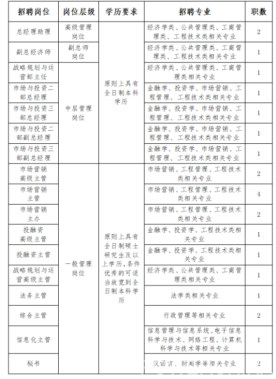 4.主導(dǎo)完成3個及以上投資金額30億元以上的項目。具備機關(guān)、事業(yè)單位處級或國有企業(yè)相對應(yīng)層級崗位工作經(jīng)驗的優(yōu)先;
