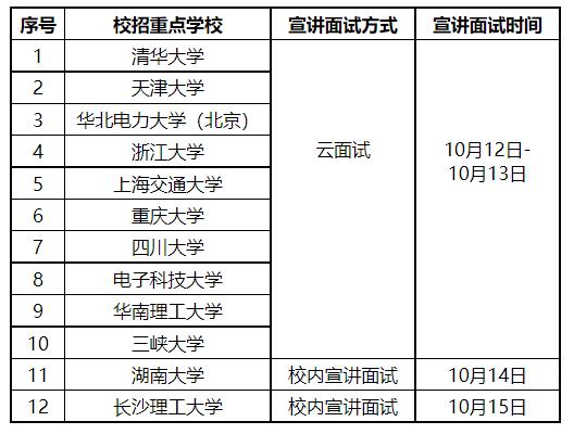 因疫情影響,國網(wǎng)湖南電力2023年校園招聘長沙站采取“校內(nèi)宣講面試”,省外其他重點院校采取“云面試”方式開展,宣講面試安排如下(招聘單位及招聘條件詳見前期發(fā)布的招聘公告):