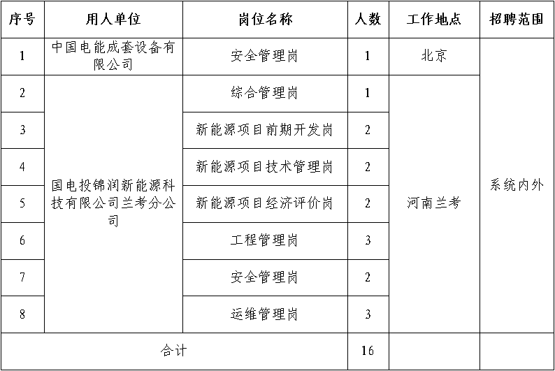 為加快推進(jìn)公司新興產(chǎn)業(yè)落地,保障各項經(jīng)營管理工作有序開展,根據(jù)相關(guān)所屬企業(yè)用人實際,面向國家電投集團(tuán)系統(tǒng)內(nèi)、外公開選聘專業(yè)技術(shù)人員共16名?,F(xiàn)將有關(guān)事項公告如下: