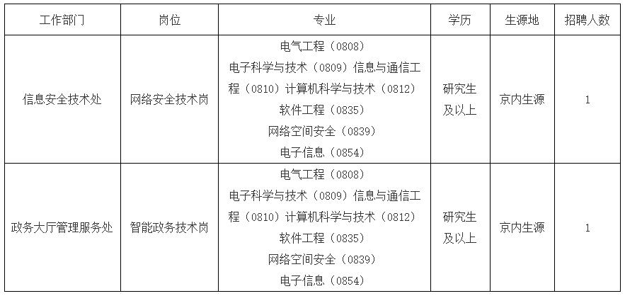 1.信息安全技術(shù)處:網(wǎng)絡(luò)安全技術(shù)崗工作人員1名(京內(nèi)生源研究生及以上應(yīng)屆畢業(yè)生)。專(zhuān)業(yè)為電氣工程(0808)、電子科學(xué)與技術(shù)(0809)、信息與通信工程(0810)、計(jì)算機(jī)科學(xué)與技術(shù)(0812)、軟件工程(0835)、網(wǎng)絡(luò)空間安全(0839)、電子信息(0854)。要求熟悉網(wǎng)絡(luò)安全和數(shù)據(jù)安全防護(hù)技術(shù)、法律法規(guī)和管理知識(shí),作風(fēng)正派、嚴(yán)謹(jǐn)細(xì)致、踏實(shí)肯干,責(zé)任心強(qiáng)、執(zhí)行力強(qiáng)、服務(wù)意識(shí)強(qiáng),具有較強(qiáng)的溝通協(xié)調(diào)能力和文字功底。