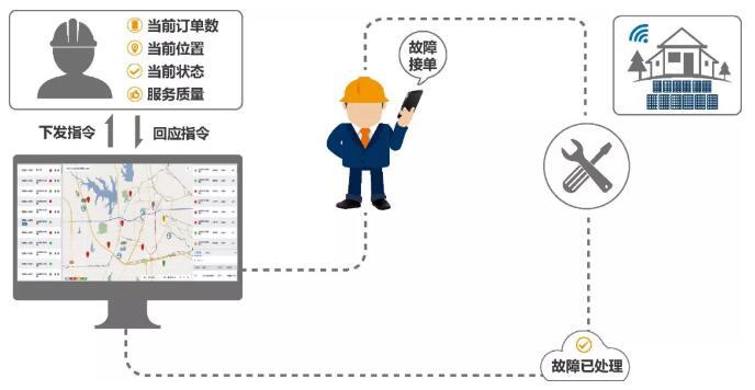 運(yùn)維方面,從成本角度考慮,村級(jí)扶貧電站不適合派人長期駐守運(yùn)維,故障的及時(shí)發(fā)現(xiàn)、分析、解決需要制定靈活高效的運(yùn)維方案。光伏行業(yè)先進(jìn)企業(yè)通過現(xiàn)代化物聯(lián)網(wǎng)技術(shù)、人工智能及大數(shù)據(jù)分析技術(shù),為光伏電站打造智慧大腦,實(shí)現(xiàn)電站實(shí)時(shí)監(jiān)測(cè)、智能分析和診斷、快速定位。此次示例設(shè)計(jì)方案中將電站接入智慧能源扶貧平臺(tái),在實(shí)現(xiàn)以上功能基礎(chǔ)之外,增加智能派單功能,實(shí)現(xiàn)及時(shí)消缺,使得村級(jí)扶貧電站的運(yùn)維更加高效。