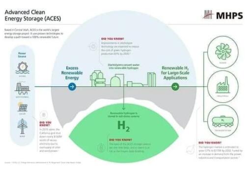MHPS還通過猶他州高級清潔能源存儲(chǔ)(ACES)項(xiàng)目,開發(fā)了網(wǎng)格化大規(guī)模的可再生氫生產(chǎn)和存儲(chǔ)技術(shù)。ACES項(xiàng)目使用可再生能源通過電解生產(chǎn)氫氣。氫氣將在現(xiàn)場的地下鹽穴實(shí)現(xiàn)跨季節(jié)存儲(chǔ),并供給墨西哥灣沿岸的煉油廠。當(dāng)風(fēng)、光可再生能源發(fā)電受限時(shí),存儲(chǔ)的可再生氫可以直接發(fā)電。