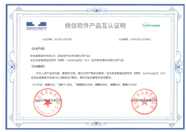 近日,遠(yuǎn)光軟件自主研發(fā)的分析型軟件產(chǎn)品資金智能監(jiān)控軟件CashInsightV2.0與國(guó)產(chǎn)操作系統(tǒng)廠商統(tǒng)信軟件推出的統(tǒng)信桌面操作系統(tǒng)V20完成產(chǎn)品兼容互認(rèn)證。測(cè)試結(jié)果表明,CashInsight V2.0在功能、兼容性方面整體運(yùn)行穩(wěn)定,滿足認(rèn)證要求。標(biāo)志著遠(yuǎn)光軟件在支持國(guó)產(chǎn)軟件兼容適配方面再下一城,支撐能力不斷加強(qiáng)。