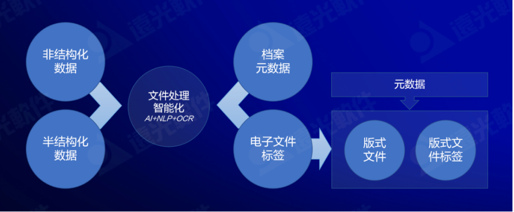 此外,還通過人工智能技術(shù),賦予機(jī)器理解文檔的能力,自動從海量非結(jié)構(gòu)化文檔中提取出結(jié)構(gòu)化信息,生成檔案元數(shù)據(jù),給歸檔文件自動打標(biāo)簽,提供檔案管理的多維信息,滿足電子檔案智能保管、高效利用的場景需求,實現(xiàn)歸檔文件的智能化處理。