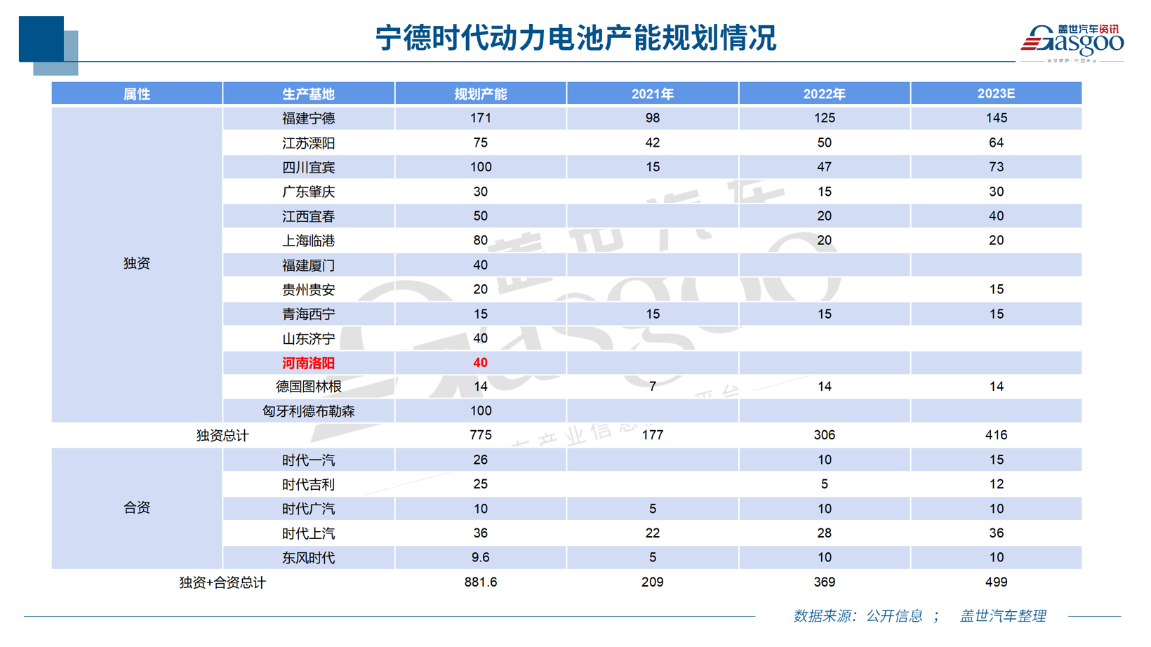 據(jù)蓋世汽車不完全統(tǒng)計(jì),截止2022年9月28日,寧德時(shí)代現(xiàn)已有包括寧德(湖東/湖西/車?yán)餅?福鼎)、江蘇溧陽、四川宜賓、青海西寧、廣東肇慶、江西宜春、上海臨港、福建廈門、貴州貴安、山東濟(jì)寧、河南洛陽以及德國、匈牙利在內(nèi)的13大獨(dú)資生產(chǎn)基地,目前規(guī)劃自有產(chǎn)能合計(jì)超700GWh。