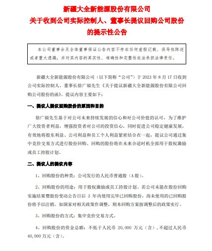 大全能源:實(shí)控人、董事長徐廣福提議以2億元-4億元回購公司股份