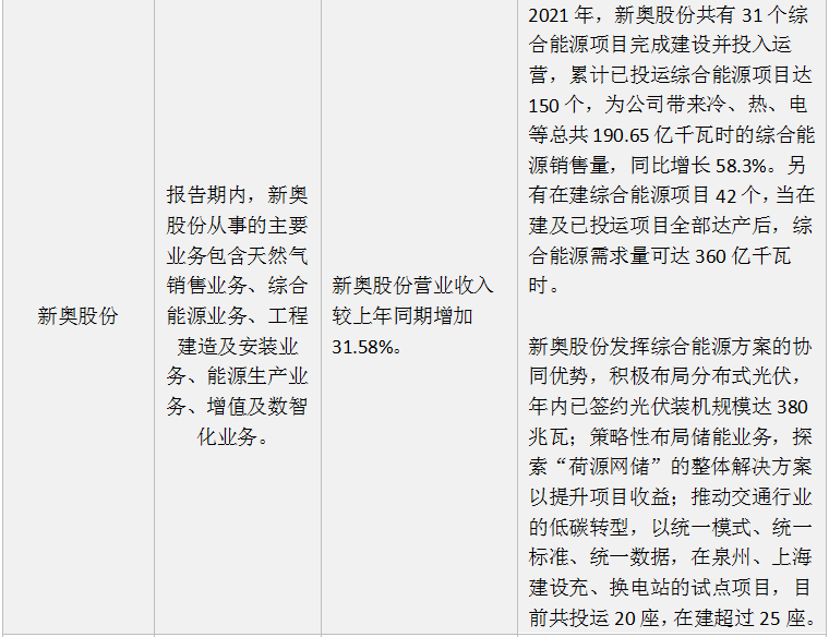 新奧股份2021年年度報告顯示,報告期內(nèi),公司營業(yè)收入較上年同期增加31.58%,主要是公司所屬子公司天然氣業(yè)務(wù)(零售、批發(fā)、直銷)氣量增加、單價上漲,以及綜合能源業(yè)務(wù)快速增長所致。在綜合能源業(yè)務(wù)方面,新奧股份重點開發(fā)低碳園區(qū)、低碳工廠、低碳建筑、低碳交通四大類客戶,以綠色低碳整體解決方案切入,大力發(fā)展終端節(jié)能、工藝優(yōu)化、能源設(shè)施托管運營等用能側(cè)服務(wù)業(yè)務(wù)。