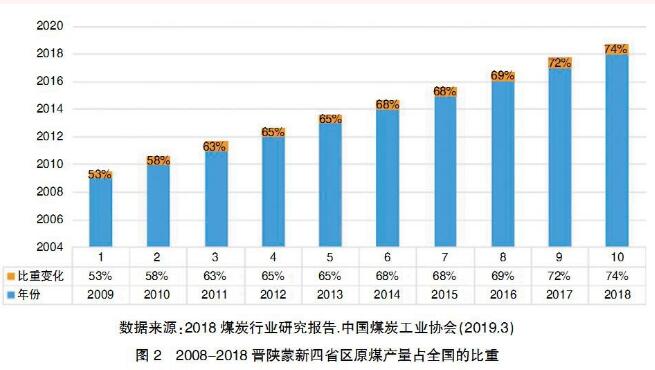 在供給側(cè)結(jié)構(gòu)性改革政策的推動下,煤炭產(chǎn)能集中度進一步提高。十八大以來,國務院相繼出臺了關于深化煤炭市場化改革的一系列文件,增大了煤炭去產(chǎn)能力度,截至到2018年底,基本上提前完成了“十三五”煤炭去產(chǎn)能8億噸的計劃,淘汰關閉了一大批不合標準的煤礦。同時,為了滿足日益增長的能源市場需要,新建、擴建、技改一批現(xiàn)代化礦井,產(chǎn)能已達到14.96億噸。據(jù)中國煤炭工業(yè)協(xié)會統(tǒng)計,全國煤礦數(shù)量從2015年的1.08萬處減少到目前的5800處,年產(chǎn)能120萬噸及以上的大型煤礦產(chǎn)量超過80%,年產(chǎn)能30萬噸及以下小型煤礦減少至10%以下。煤炭開采向大型煤炭基地集中,其產(chǎn)量占全國總產(chǎn)量的95%以上,5000萬噸級以上大型礦井產(chǎn)量占60%以上。煤炭生產(chǎn)布局進一步向晉、陜、蒙、新地區(qū)等地區(qū)集中。2018年,內(nèi)蒙古、山西、陜西、新疆、貴州、山東、河南、安徽等8個億噸級規(guī)模以上企業(yè)原煤產(chǎn)量達31.2億噸,占全國的88.1%,其中,晉、陜、蒙、新四省(區(qū))原煤產(chǎn)量占全國的74.3%。見圖1、圖2。