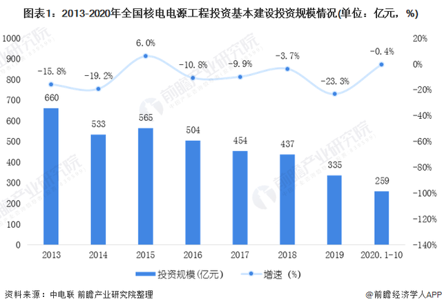 受到福島核電站等事故的影響,我國(guó)核電建設(shè)雖然處在高速發(fā)展期,但是保持著以“穩(wěn)”為主的基調(diào),新開(kāi)工機(jī)組數(shù)量較少,核電工程投資額有所下滑。根據(jù)中國(guó)電力企業(yè)聯(lián)合會(huì)的統(tǒng)計(jì)數(shù)據(jù)顯示,2020年1-10月,全國(guó)主要核電企業(yè)電源工程完成投資259億元,同比下降0.4%。