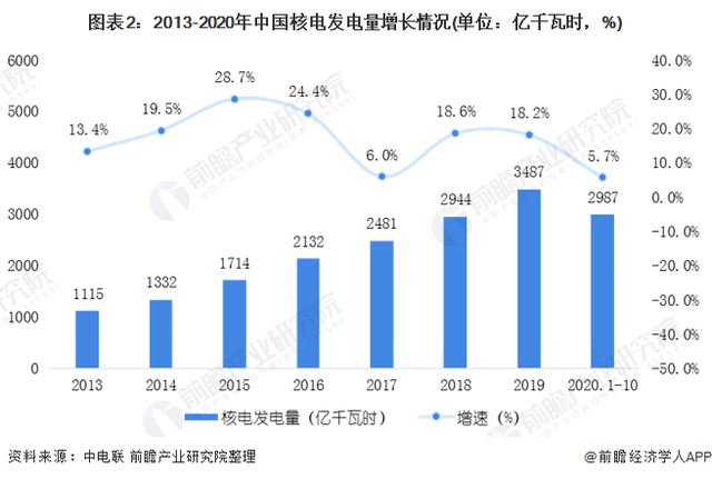 雖然近年來(lái)受?chē)?guó)家核電批復(fù)減少以及新建投資額的降低的影響,我國(guó)核電主要企業(yè)電源項(xiàng)目在建規(guī)模有所縮小,但是隨著項(xiàng)目的完工,我國(guó)核電裝機(jī)規(guī)模不斷擴(kuò)大,發(fā)電量同步提高。根據(jù)中國(guó)電力企業(yè)聯(lián)合會(huì)的數(shù)據(jù)顯示,2020年1-10月,全國(guó)核電發(fā)電量2987億千瓦時(shí),同比增長(zhǎng)5.7%,增速比上年同期回落13.6個(gè)百分點(diǎn)。