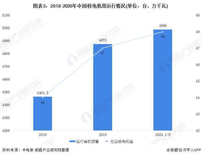 截至2019年底,中國(guó)在運(yùn)核電機(jī)組共47臺(tái),分別位于8個(gè)沿海省份的13個(gè)核電基地中,運(yùn)行裝機(jī)容量達(dá)到4875萬(wàn)千瓦,位居世界第三,占全國(guó)總裝機(jī)容量的2.5%左右。截止2020年9月底,中國(guó)在運(yùn)核電機(jī)組48臺(tái),總裝機(jī)容量4988萬(wàn)千瓦。