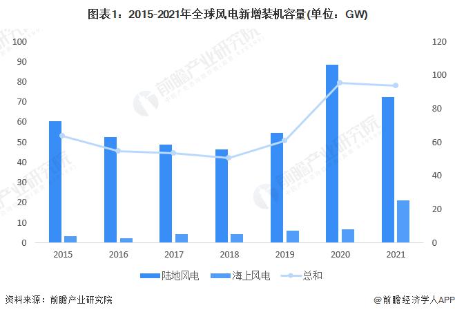 全球風(fēng)能理事會 ( GWEC ) 發(fā)布的《全球風(fēng)能報告 2022》指出,得益于技術(shù)進(jìn)步和商業(yè)模式創(chuàng)新,風(fēng)能行業(yè)正在快速發(fā)展,2021 年全球新增風(fēng)電裝機(jī)容量 93.6GW,較 2020 年下降 1.8%。其中陸上風(fēng)電新增裝機(jī)容量 72.5GW,海上風(fēng)電新增裝機(jī)容量為 21.1GW,與往年相比,海上風(fēng)電新增裝機(jī)容量大幅上升。