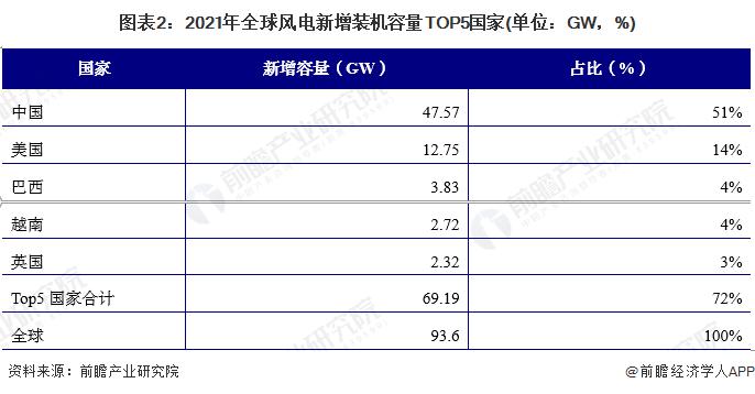 在全球風(fēng)電增速放緩的背景下,中國風(fēng)電裝機(jī)量有所回落。但 2021 年中國風(fēng)電新增裝機(jī)容量仍居全球第一,實現(xiàn)新增裝機(jī)容量 47.57GW,占全球新增裝機(jī)容量的 51%,其中陸上風(fēng)機(jī)裝機(jī)容量新增 30.67GW,海上風(fēng)機(jī)裝機(jī)容量新增 16.90GW; 其次為美國,新增裝機(jī)容量 12.75GW,占比 14%,全為陸上風(fēng)機(jī) ; 巴西和越南緊隨其后,均占全球風(fēng)電新增裝機(jī)容量的 4%; 英國新增裝機(jī)量 2.32GW,占比也達(dá)到 3%。五大國共計新增裝機(jī)量 69.19GW,占全球新增裝機(jī)量比重約 72%。