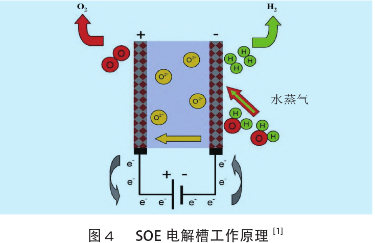 固體氧化物電解槽(SOE)利用高溫水蒸氣(600~900℃)電解,效率高于堿性電解槽和PEM電解槽。20世紀60年代,美國和德國就開始進行SOE高溫水蒸氣的相關(guān)研究。SOE電解槽的工作原理如圖4所示。循環(huán)氫氣和水蒸氣從陽極進入反應(yīng)系統(tǒng),水蒸氣在陰極電解成氫氣,陰極產(chǎn)生的O2–通過固體電解質(zhì)移動到陽極,重新結(jié)合形成氧氣并釋放電子。