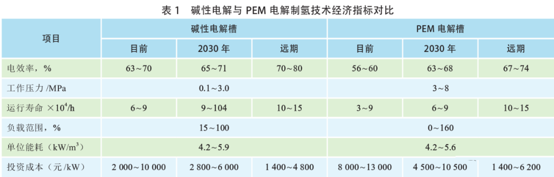 我國以可再生能源(如風電、光伏、水電)進行電解水制氫,電價控制在0.25元/kWh以下時,制氫成本具有相對經(jīng)濟性(15.3~20.9元/kg)。堿性電解與PEM電解制氫技術(shù)經(jīng)濟指標見表1。