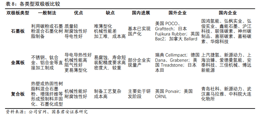 雙極板(BP):依材質可分為石墨雙極板、金屬雙極板和復合雙極板。氫燃料電池目前主要采用石墨板或金屬板,釩液流電池傾向復合板。國產化進程方面,石墨板基本已實現國產化,金屬板已有部分企業(yè)實現量產,復合板尚處研發(fā)階段。