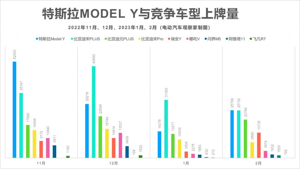 通過 1 月份 4 萬元左右的降幅,Model Y 在 2 月份開始回到 " 月銷 3 萬 " 的趨勢(shì)當(dāng)中,并對(duì)競爭對(duì)手產(chǎn)生了連鎖反應(yīng):