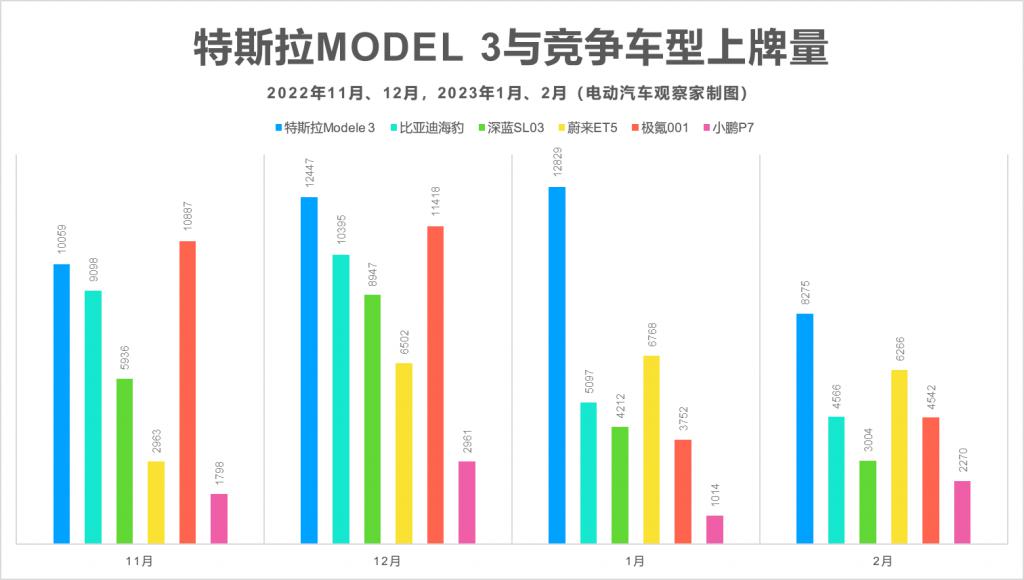 1 月份 3 萬元左右的降價(jià)只為 Model 3 帶來了 3% 的環(huán)比增長,2 月份環(huán)比下降 55%。