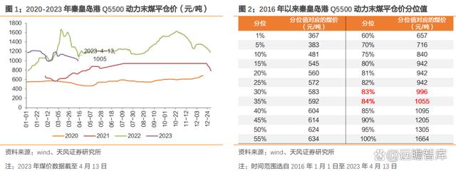 近期煤價(jià)持續(xù)回落,但仍處于歷史較高分位。2023 年 4 月 13 日秦皇島 Q5500 動(dòng)力末煤平倉(cāng)價(jià)為 1005 元/噸,較年內(nèi) 1 月份高點(diǎn)(1215 元/噸)下降 17.28%,較 2022 年以來峰值(1664元/噸)已回落 39.60%。歷史對(duì)比來看,當(dāng)前秦皇島 Q5500 動(dòng)力末煤平倉(cāng)價(jià)位于 2016 年以來的 83%~84%分位高點(diǎn),仍處于歷史高位。