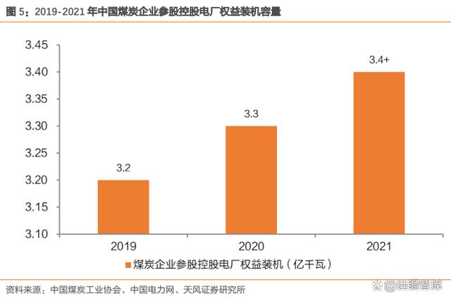 煤電聯(lián)營(yíng)持續(xù)推進(jìn),2021 年底煤炭企業(yè)參股控股電廠權(quán)益裝機(jī)容量超過 3.4 億千瓦,比2015 年增加 1.9 億千瓦,占全國(guó)燃煤電力裝機(jī)的 30.6%。